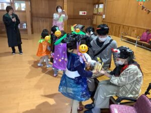 きょとんとされておりましたが、せきれい苑スタッフから「ハッピーハロウィン!」と答え、琴丘保育園の子供たち全員にお菓子のプレゼント🎁をします。代表で受け取った子供は、いつもせきれい苑に来てくれるぞうくみの子供たち。もう顔なじみです!