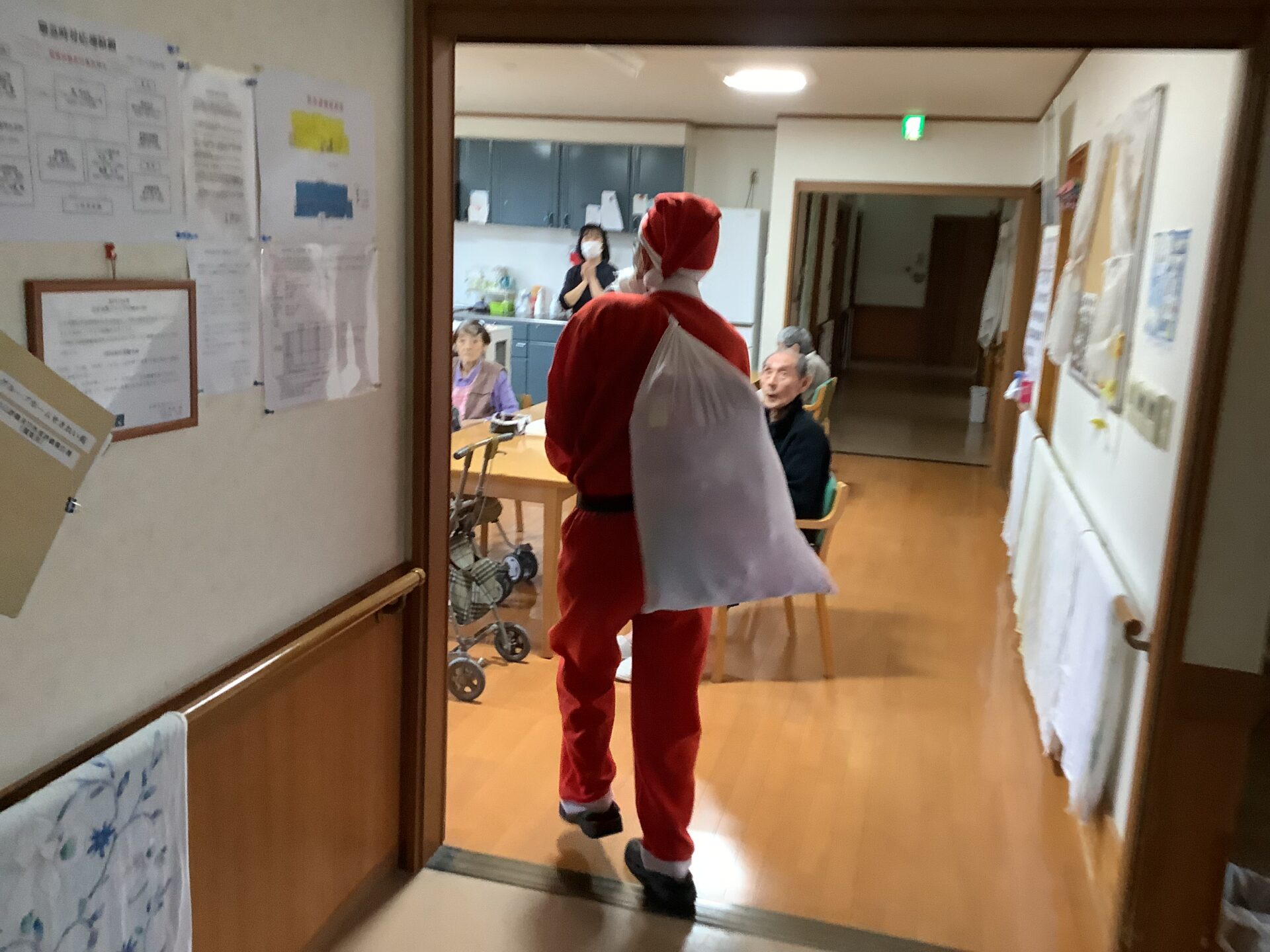 せきれい苑にもサンタクロース🎅がやってきました。今年は燃料費高騰と、まだ雪が積もっていない為、トナカイを手配しなかったようで、どこからともなく歩いて登場!!