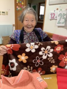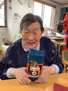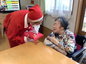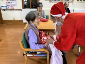 入居者の皆さん、サンタの突然の登場に驚きと嬉しさで、表情がイマイチ。プレゼント🎁が配られると、徐々にいつもの笑顔が見られました💦