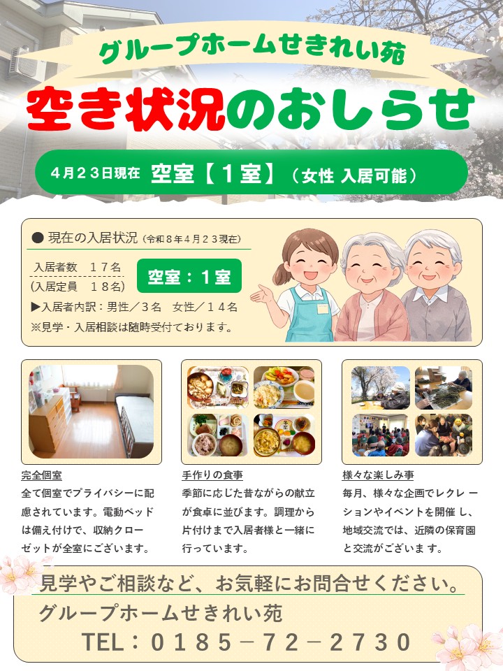 【グループホームせきれい苑】空室状況のお知らせ(2026年4月23日現在)