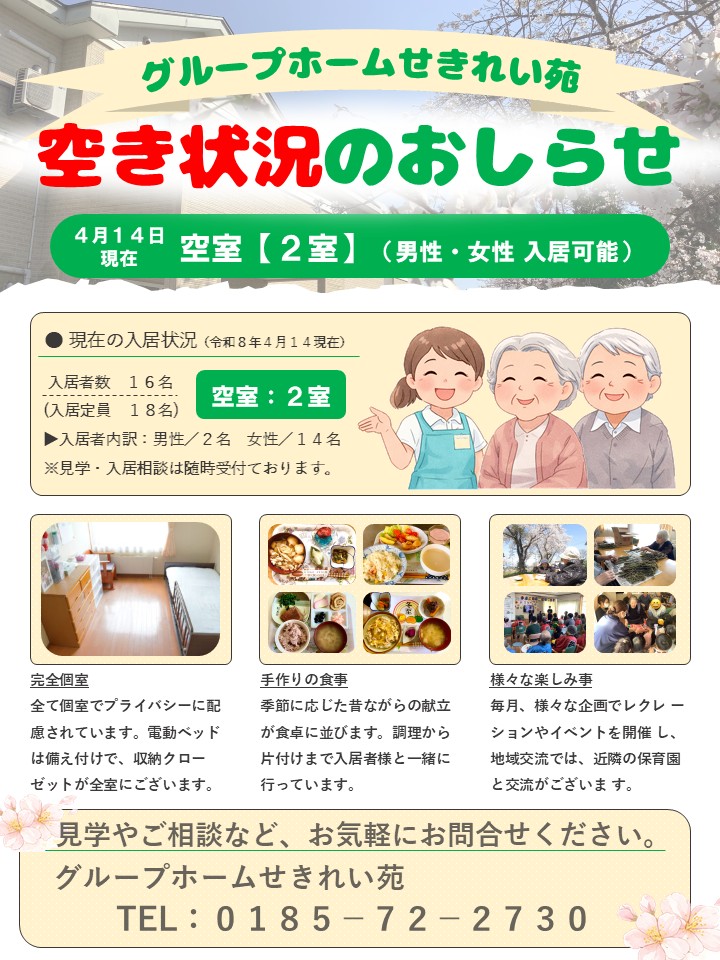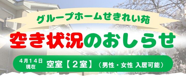 【グループホームせきれい苑】空室状況のお知らせ(2026年4月14日現在)