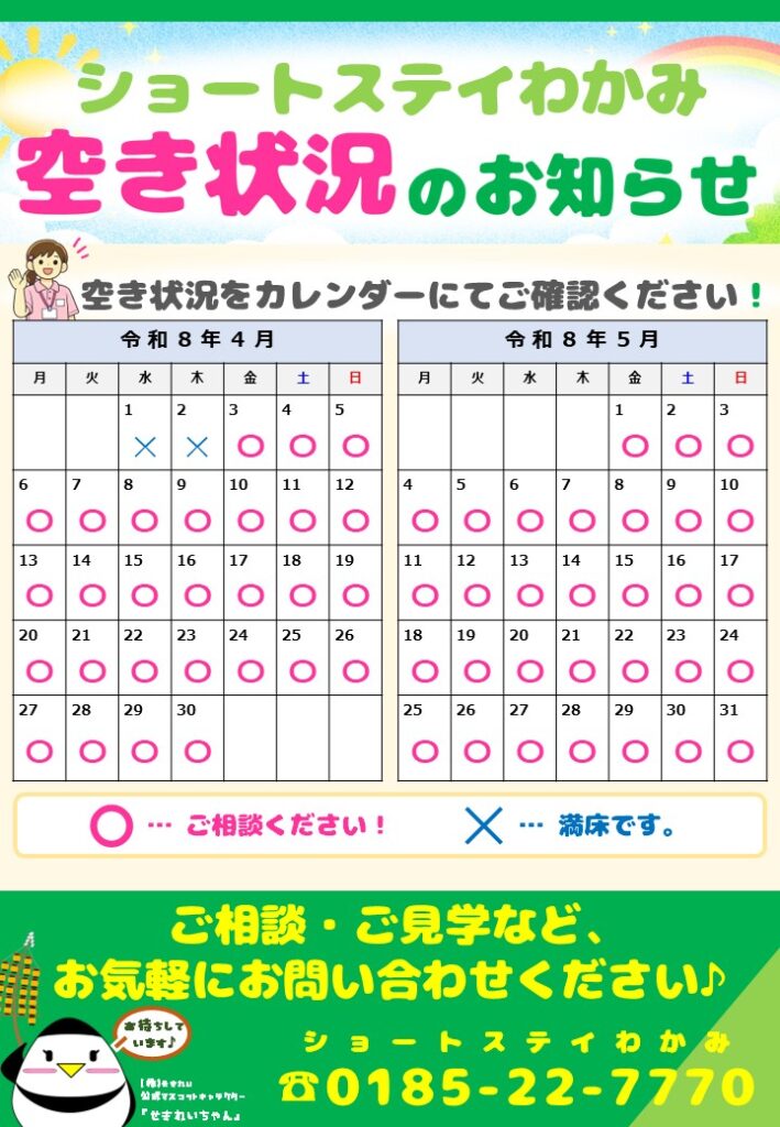 ショートステイわかみより、現在の空き状況についてお知らせいたします。